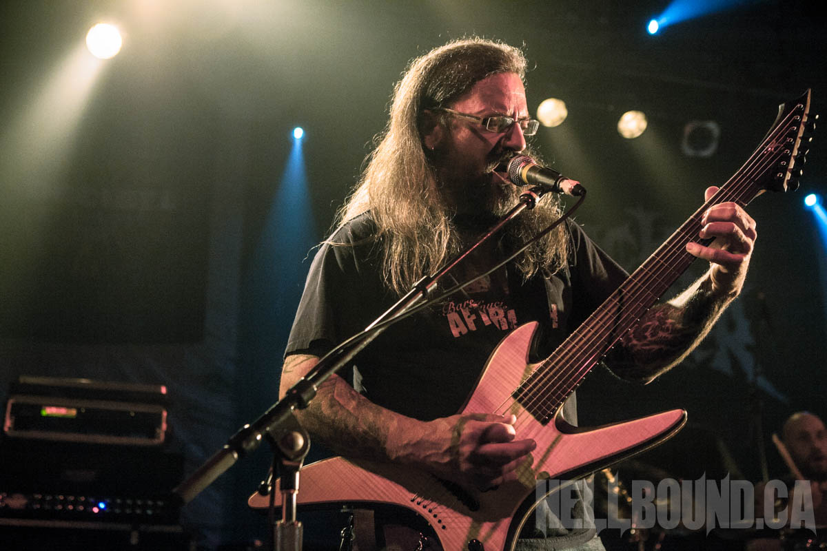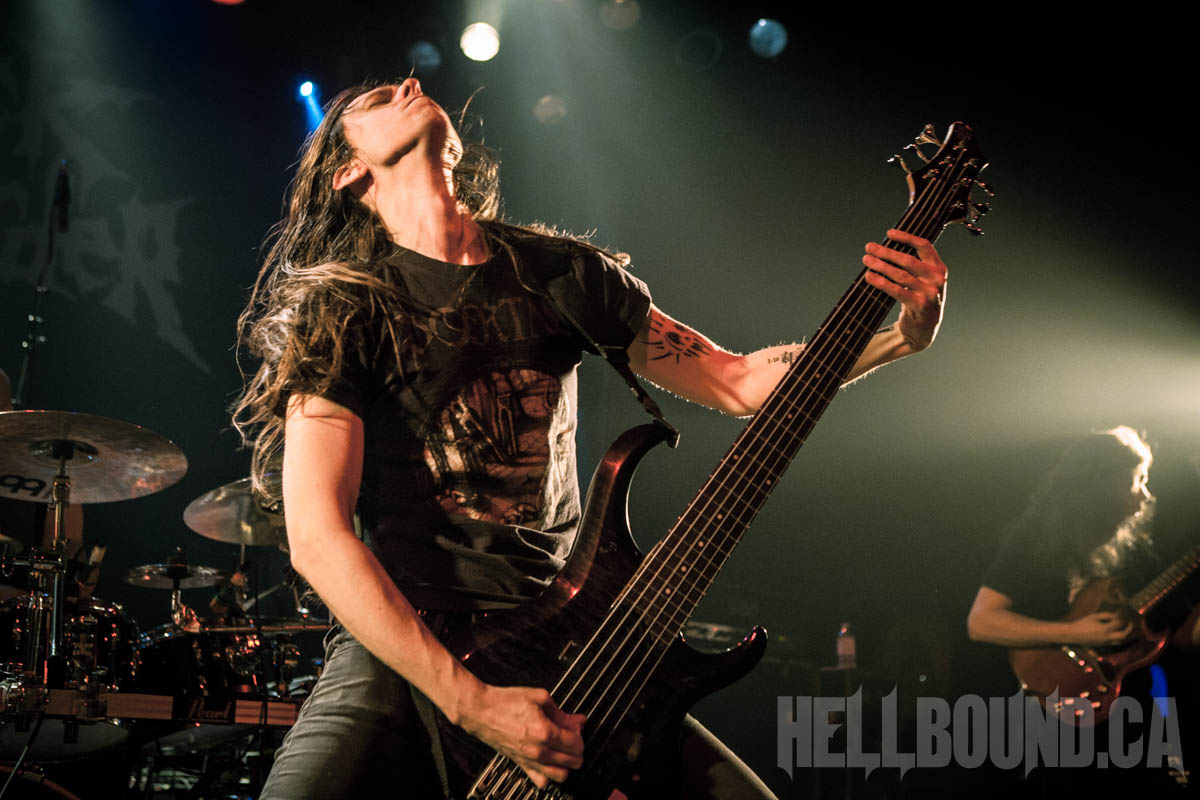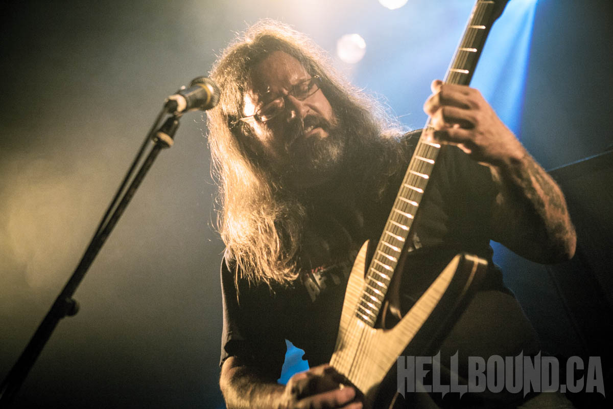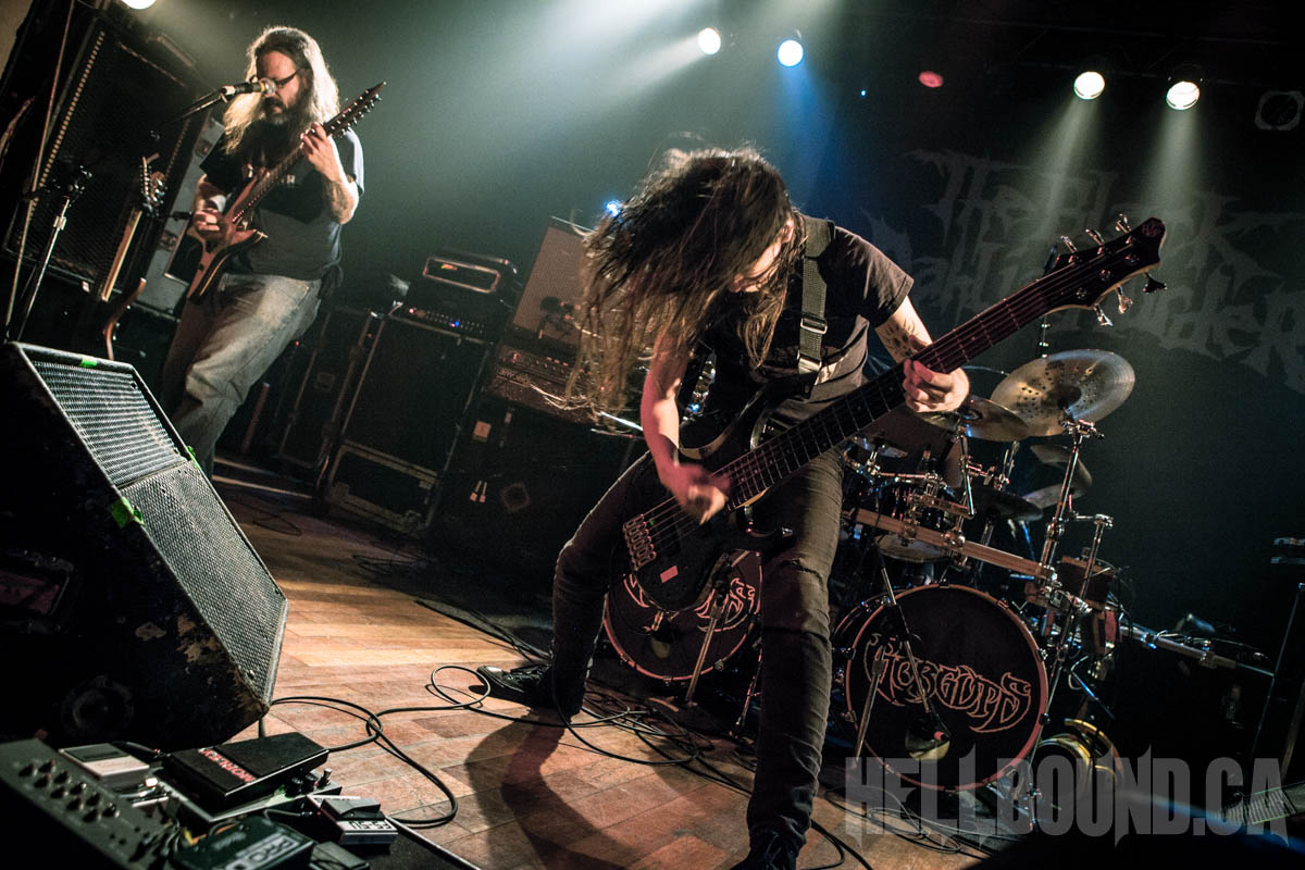 Gorguts‘ performance began with a fair bit of sound tweaking and a roomful of atmosphere. Gorguts songs don’t make for good background music, and this becomes even more obvious but also more of an asset in a live setting. The band didn’t just demand full attention – they commanded it. While founder/guitarist/vocalist Luc Lemay positions himself off to the side (his predominant role doesn’t need visual emphasis), Colin Marston on bass occupies centre stage like a work of performance art. On his other side, Kevin Hufnagel headbangs erratically, beautifully in tandem with the complexity of his guitar work. And drummer John Longstreth Patrice Hamelin provides a visual and rhythmic anchor for the whole. Moments of fascinating delicacy made the heavy that much heavier, and after dedicating final track “Obscura” to the pit (the first real talking Lemay did), Gorguts’ set climactically morphed into the sounds of loud and fervent appreciation.