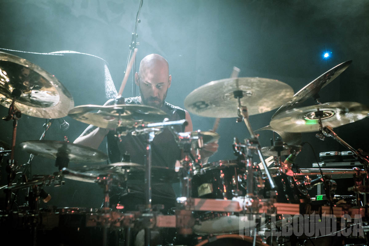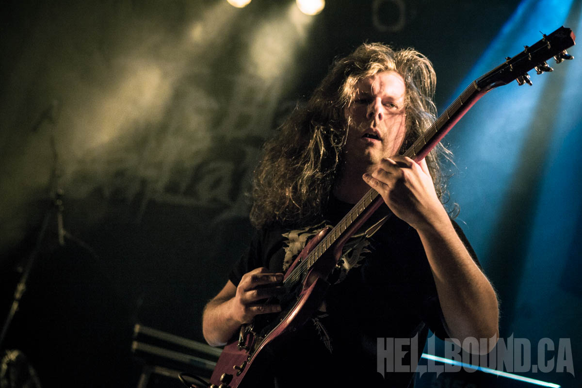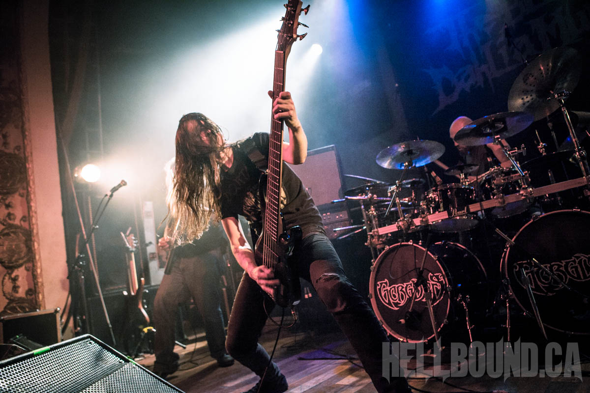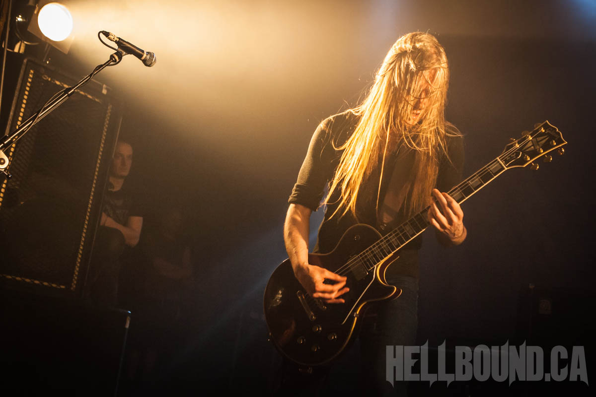 Gorguts‘ performance began with a fair bit of sound tweaking and a roomful of atmosphere. Gorguts songs don’t make for good background music, and this becomes even more obvious but also more of an asset in a live setting. The band didn’t just demand full attention – they commanded it. While founder/guitarist/vocalist Luc Lemay positions himself off to the side (his predominant role doesn’t need visual emphasis), Colin Marston on bass occupies centre stage like a work of performance art. On his other side, Kevin Hufnagel headbangs erratically, beautifully in tandem with the complexity of his guitar work. And drummer John Longstreth Patrice Hamelin provides a visual and rhythmic anchor for the whole. Moments of fascinating delicacy made the heavy that much heavier, and after dedicating final track “Obscura” to the pit (the first real talking Lemay did), Gorguts’ set climactically morphed into the sounds of loud and fervent appreciation.