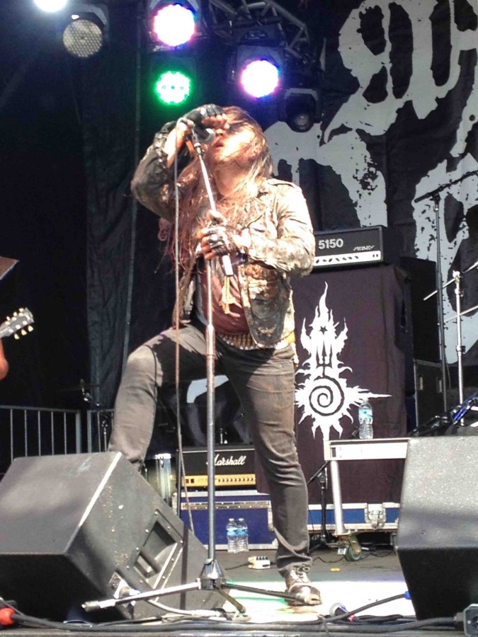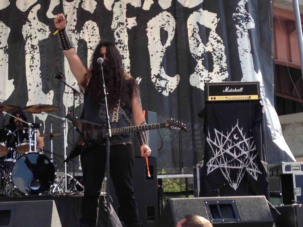 To deviate from the doom, it was time for some more devil worship. Russia’s Pseudogod got those festivities started with a bloody bang. And by bloody, I mean literally bloody. The band looked like they had cut each other up before their performance as they were all caked with blood, sweat, and whatever else. Plus, vocalist I.S.K.H. had a pretty sizable inverted cross rosary gleaming in the summer sun. Regardless, their brand of black metal reminded me of Black Witchery with just a bit more going on in the riffs. Indeed that comparison seems even more àpropos considering Black Witchery’s Impurath was playing bass on the live stage. It worked well, but I thought their getup was a bit silly for the sunshine and I was worried for their health.