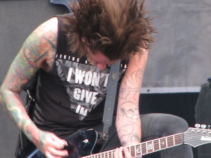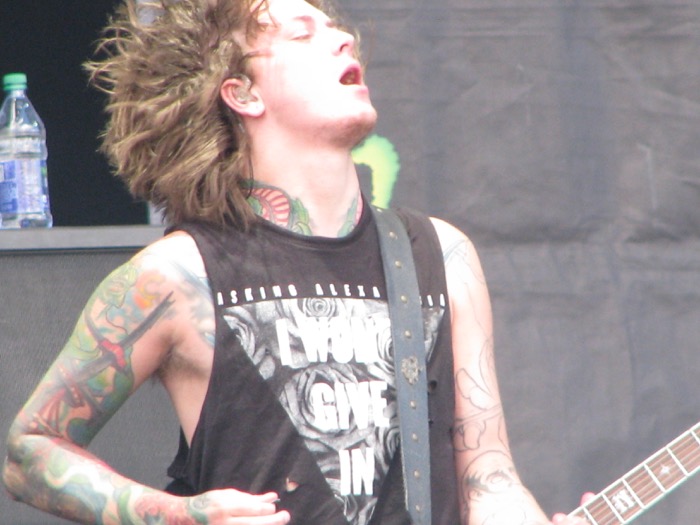 I joined my companions for the last half hour or so of the non-stop 1-2-3-4 of Marky Ramone’s Blitzkrieg with Andrew W.K. on vocals. Next on the main stage was Asking Alexandria, performing with their new frontman. It’s hard to believe such monumental growls can come from such a delicate-looking frame, but the band performs heavy at least as well as they pull off the melodic contrasts. It was an entertaining set, but not enough to keep me from leaving early to catch Sanctuary on the other side of the park.