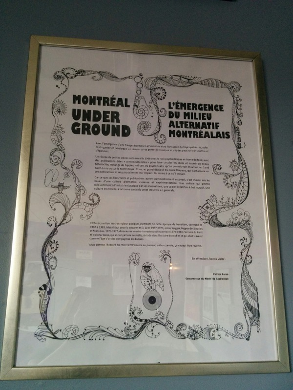 A few months later, le Musée hosted a stationary exhibition on heavy metal in Quebec, and I so wanted to attend but it just wasn’t in the cards. What I did get to check out, however, was the most recent exhibition on underground music in Montreal, mostly focused on the sixties and seventies. The connection to my heavier interests may have been somewhat tangential, but the exhibition was well worth my time.
