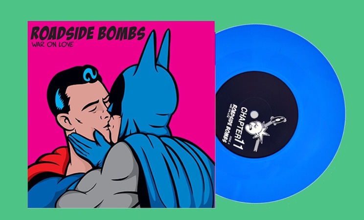 It might not be for everyone but, for me, some of the coolest things to hear are those which crosswire a few different sounds and styles which feel as though they should stand at odds with one another. A perfect example of such an unusual stylistic counterpoint can be found on Roadside Bombs‘ new single, “War On Love,” pressed on “super” cyan blue vinyl (the color of Superman’s tights). Even before a note is heard listeners will be treated to the potentially provocative image of Batman passionately French kissing which appears on the cover of the single. It might sound silly, but that alone seems destined to get listeners’ curiosity up – but the going gets better when one realizes that’s only the beginning of this two-track treat.