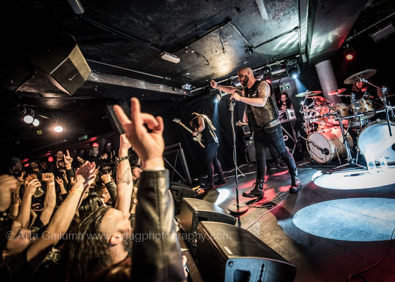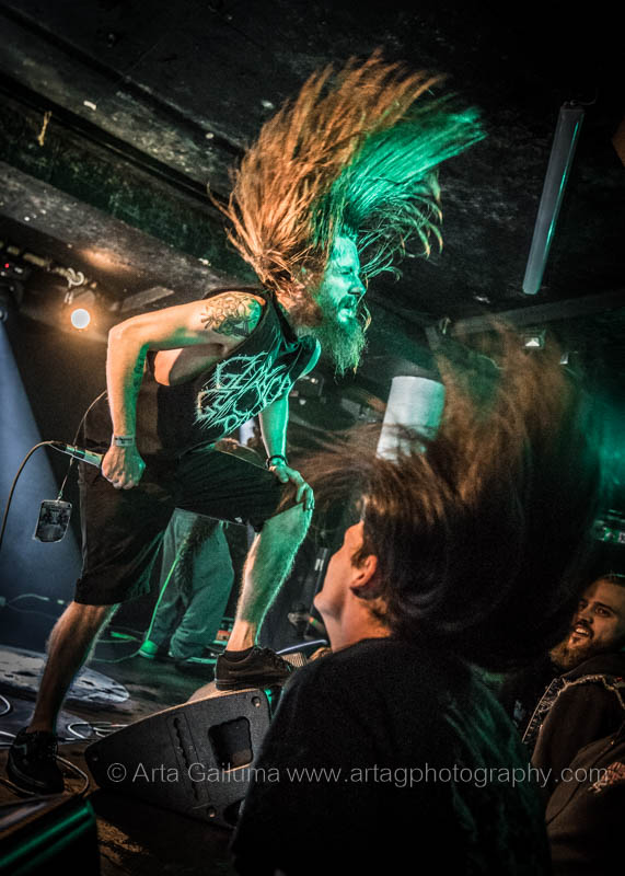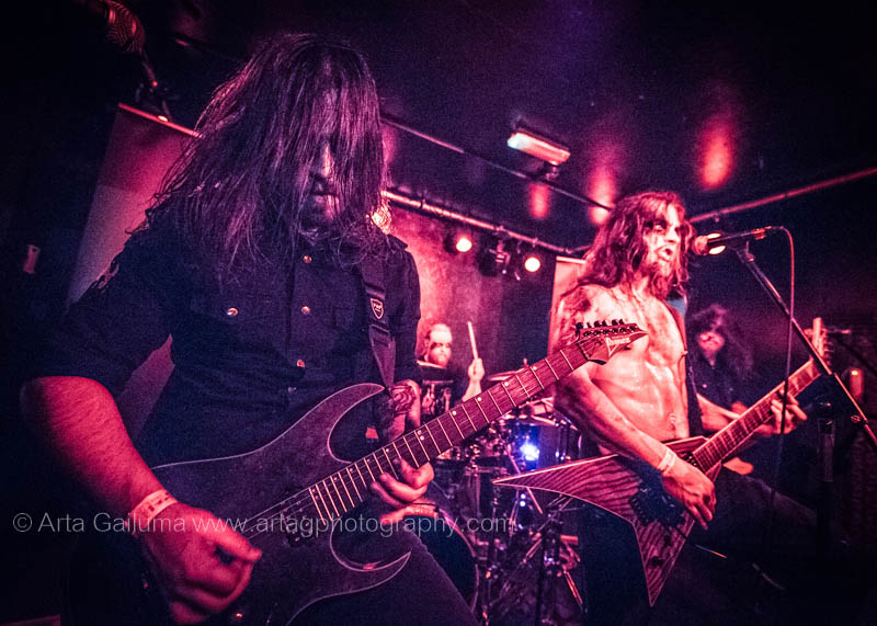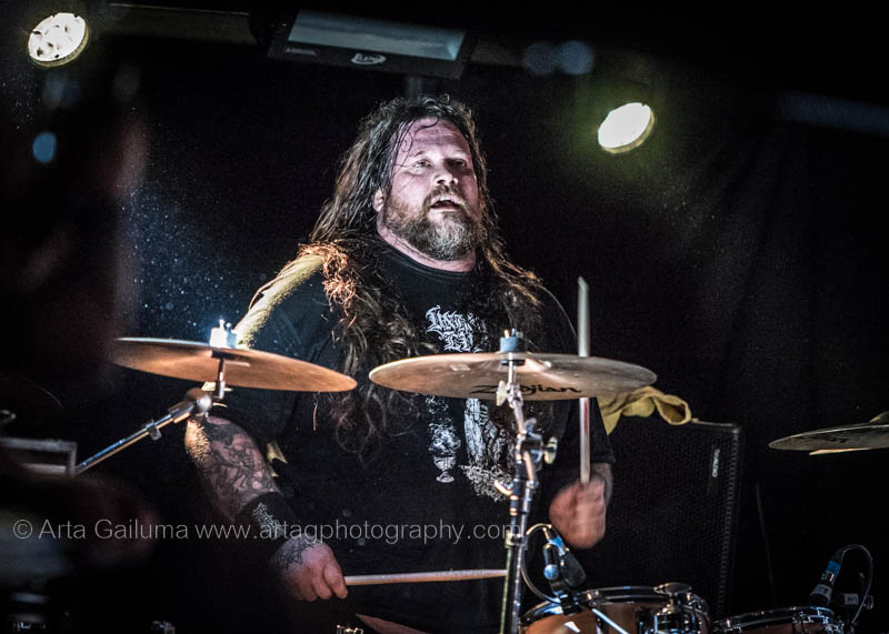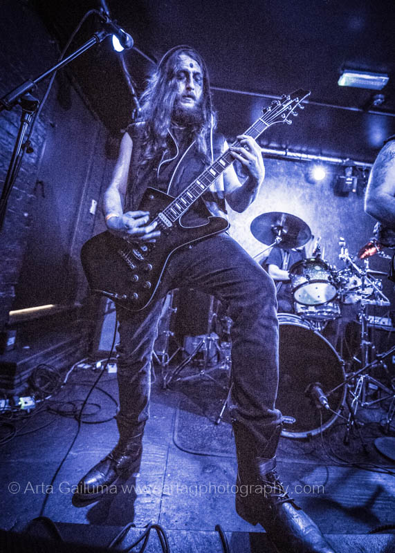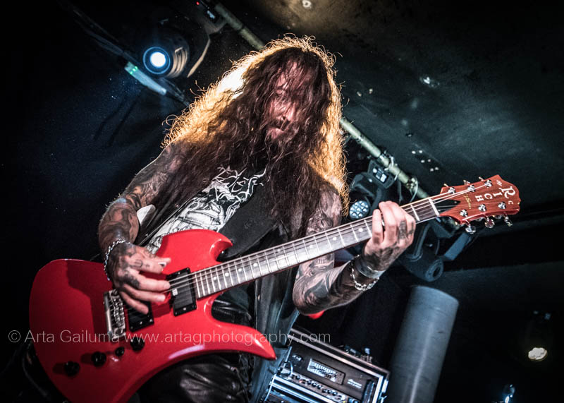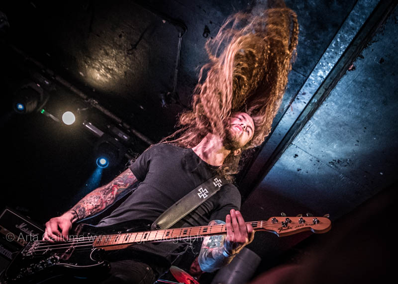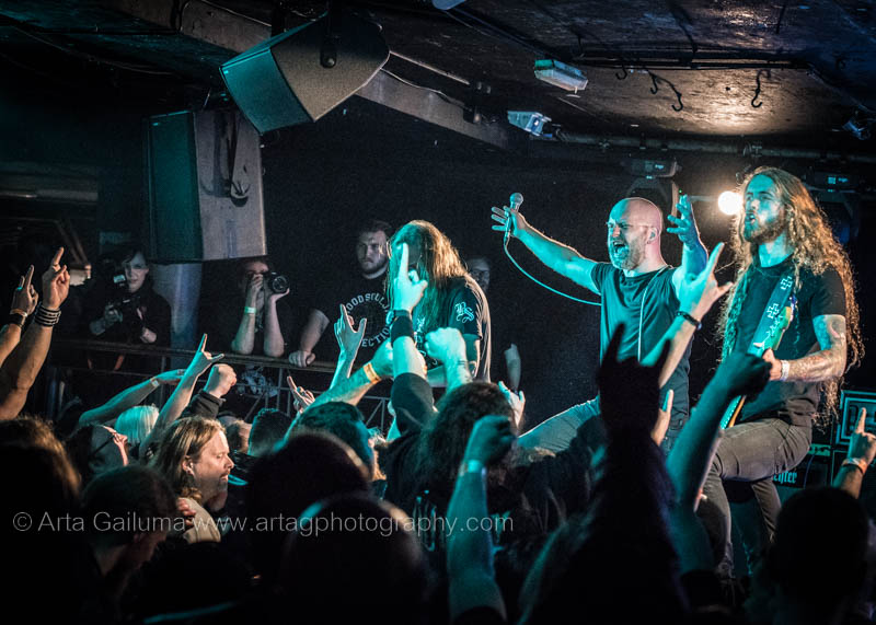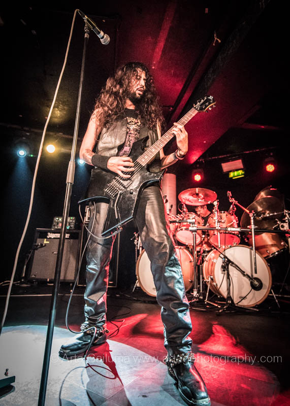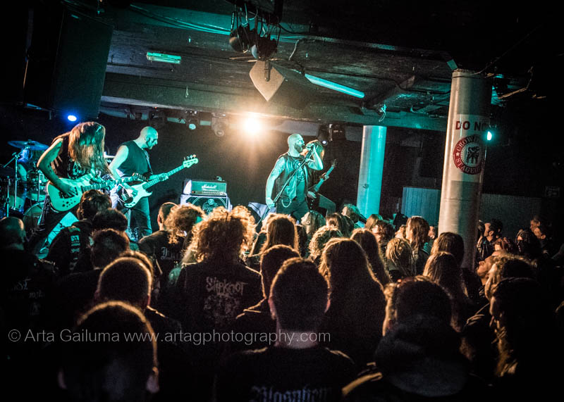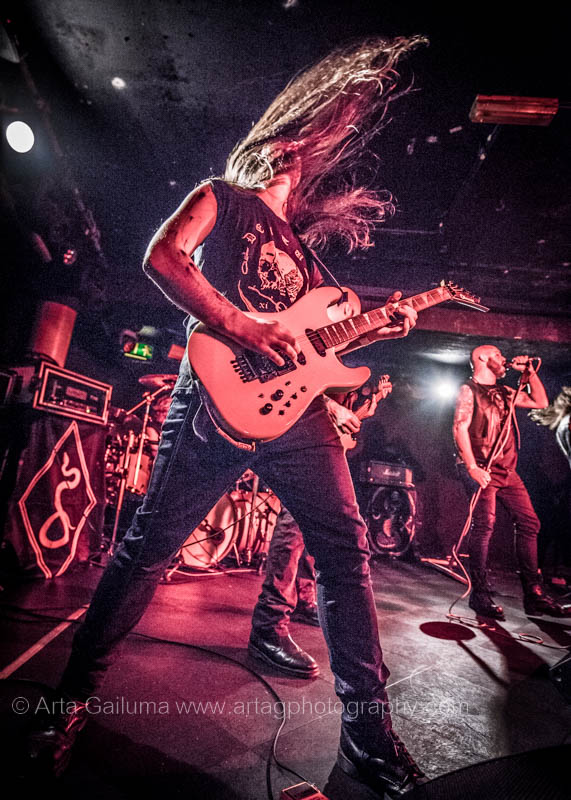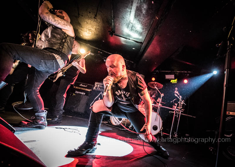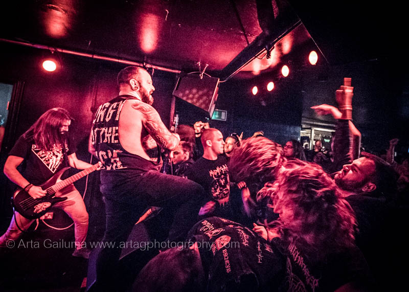 The 500 capacity venue The Underworld was ram packed tonight to see headliners Dutch thrashers Asphyx with their drummer Husky from mighty Sodom tear the place down. The hair was flying, fists pumping the air and the crowd was going wild. The mid height stage was perfect for fans to claim on it and jump into the stretched out arms for a crowdsurf.